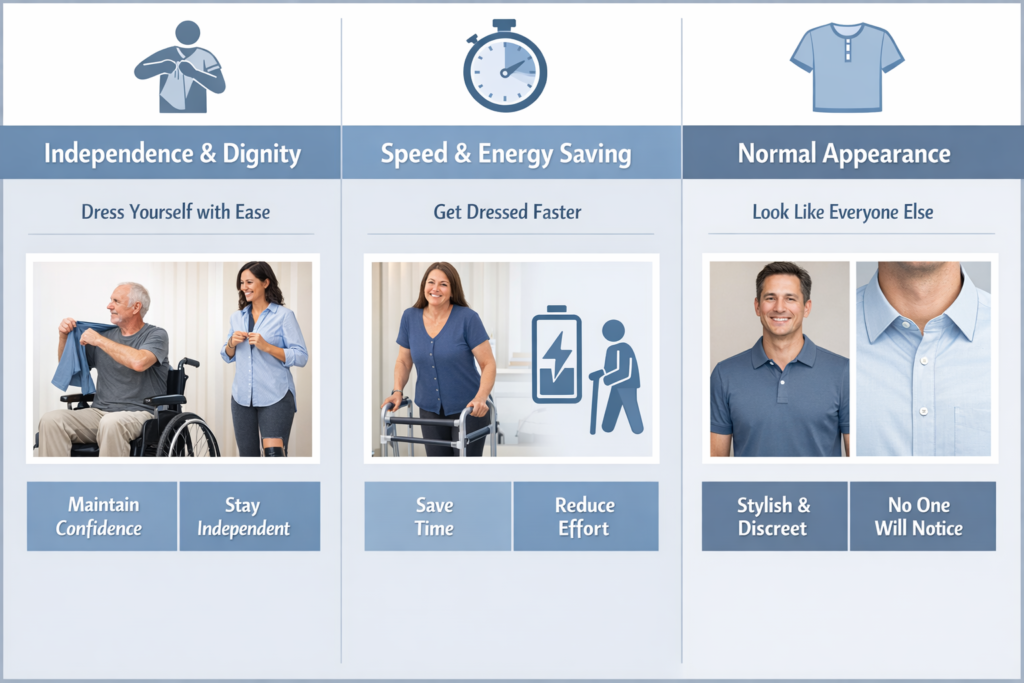 Being able to dress yourself, even just more easily than before, restores a sense of control. It also helps preserve dignity, which is one of the most important parts of living well with a chronic condition. Dignity is not vanity. Dignity is the ability to move through your day without feeling exposed, helpless, or infantilized.