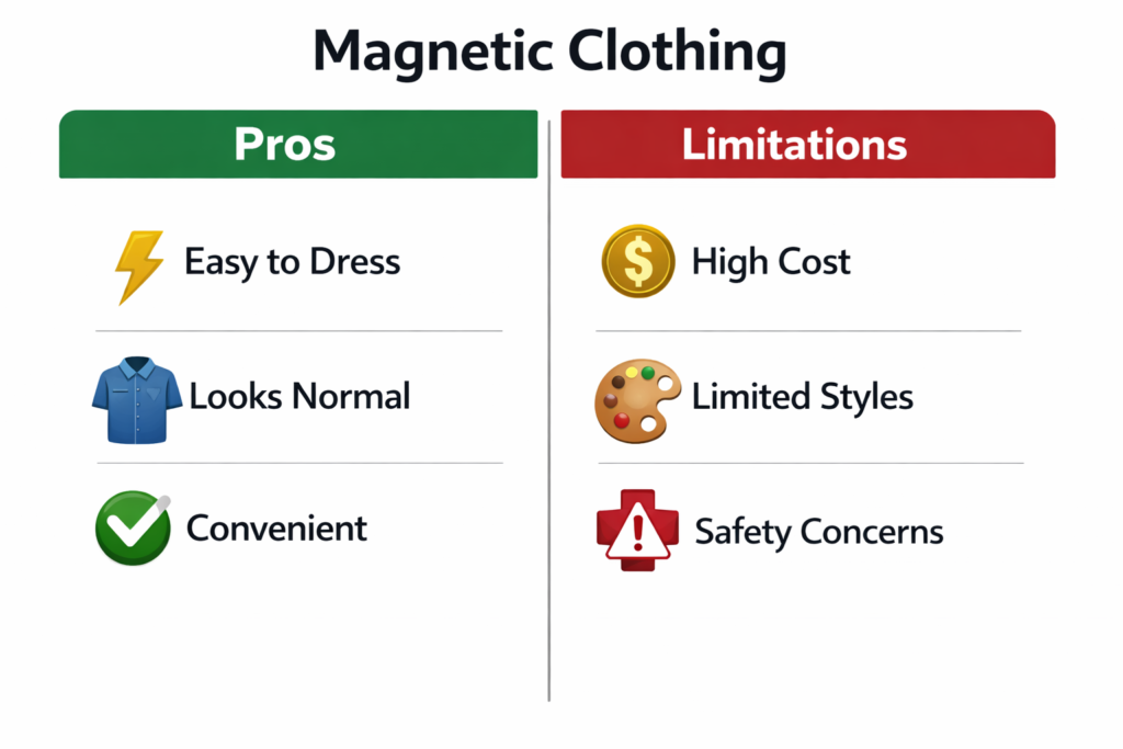 The biggest strengths are easy to see. The shirt is fast to put on. It feels well made. It looks like normal clothing. The magnetic closures work reliably during real movement. It supports dignity and independence. It is especially helpful for anyone dealing with tremor, stiffness, or limited fine motor control.