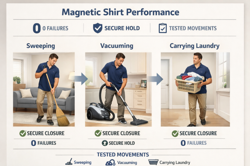 The magnet test also helps address one of the biggest myths around magnetic clothing: the idea that magnets are too weak to be dependable. In this case, they were dependable during the kinds of activities most people do at home every day.