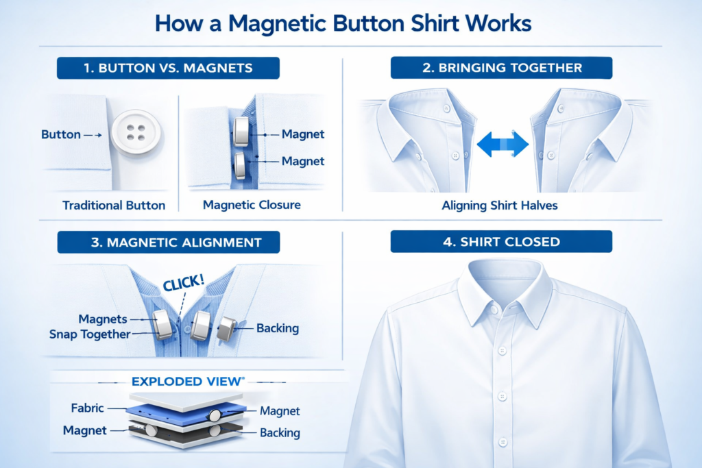 A traditional button-down shirt requires repeated fine motor actions. You have to align, push, adjust, and often try again. With magnetic closures, that process becomes much simpler.