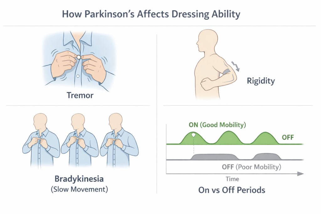 For many people, getting dressed is one of the first places Parkinson’s starts to push back against independence. Tremor makes hands less steady. Rigidity makes arms harder to lift. Slowness makes even a simple morning routine stretch out far longer than it should. And when medication is not working at its best, those same small tasks can become nearly impossible.