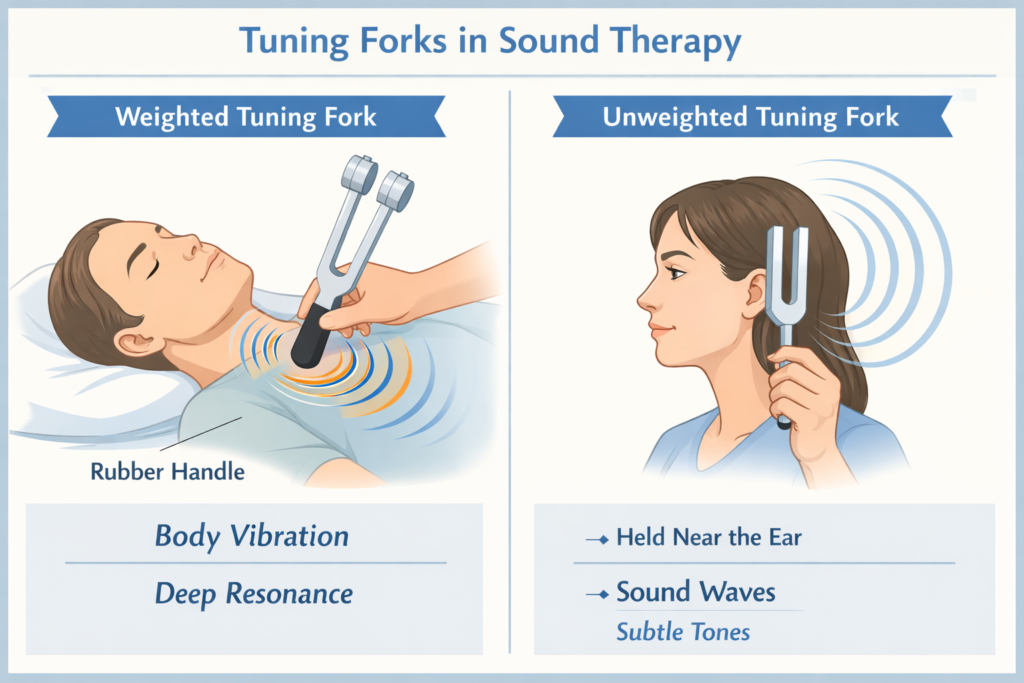 In sound therapy, we use two main types of tuning forks: Weighted (body) forks and Unweighted (sound) forks.