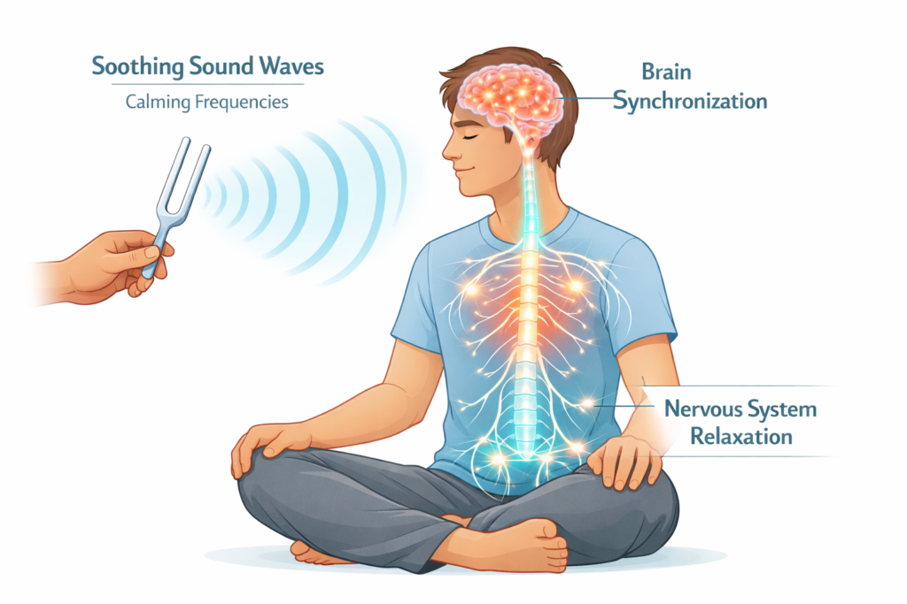 Unweighted forks can also be used on reflex points. Placing the vibrating stem on your palm or sole sends sensory input through nerves to the brain. This can help co-regulate the nervous system. For example, lightly touching a vibrating fork to the forehead or face can carry calm into the mind. This is similar to binaural-beat therapy, which aligns brainwaves, but with a real instrument.